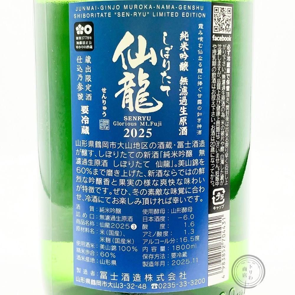 栄光冨士 仙龍(せんりゅう) 純米吟醸 無濾過生原酒 しぼりたて [山形] / 720 ml, 1800 ml
